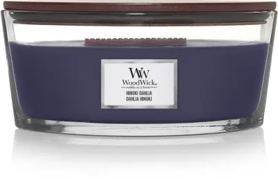 WoodWick geurkaars hinoki dahlia ellipse candle is voorzien van een natuurlijk, houten lont waardoor het rustgevende geluid van een knisperend haardvuur een unieke sfeer creëert, terwijl jouw woonruimte gevuld wordt met een authentieke, natuurlijke geur.
