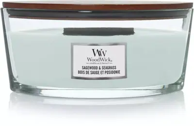 WoodWick geurkaars sagewood & seagrass ellipse candle is voorzien van een natuurlijk, houten lont waardoor het rustgevende geluid van een knisperend haardvuur een unieke sfeer creëert, terwijl jouw woonruimte gevuld wordt met een authentieke, natuurlijke geur.