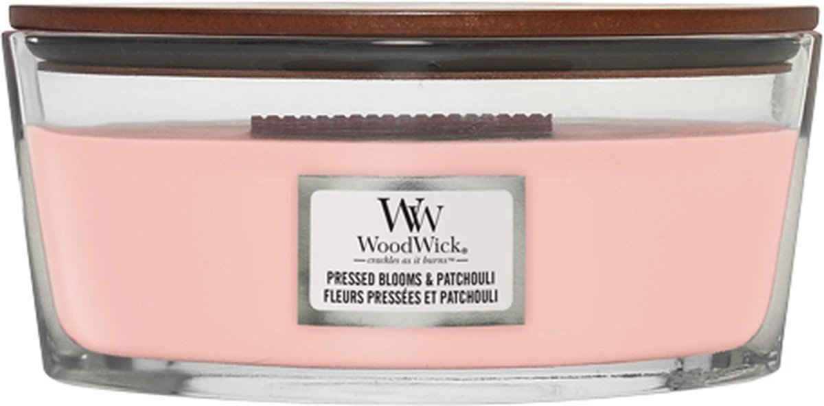 De WoodWick Pressed Blooms & Patchouli geur is geïnspireerd op trendy geurnoten van aardse groenten, zomerhout en de heerlijkste bloemen. Deze WoodWick lentegeur laat de geuren van delicate bloemen die bloeien op een bed van houtachtige vetiver- en patchoeli-aroma’s door je huis verspreiden. Daarnaast geeft de houten lont een rustgevend knisperend geluid, alsof de haard aanstaat. Time to relax. Met deze WoodWick geurkaars geniet je ongeveer 50 branduren van een heerlijk geurende kaars, die alle zintuigen prikkelt.