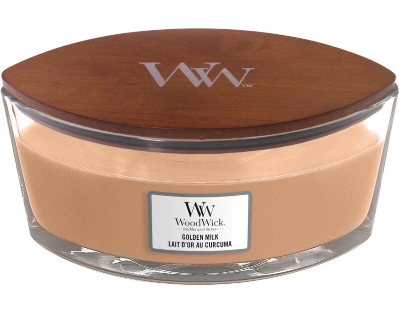 De geurkaars WoodWick Golden Milk Ellipse Candle