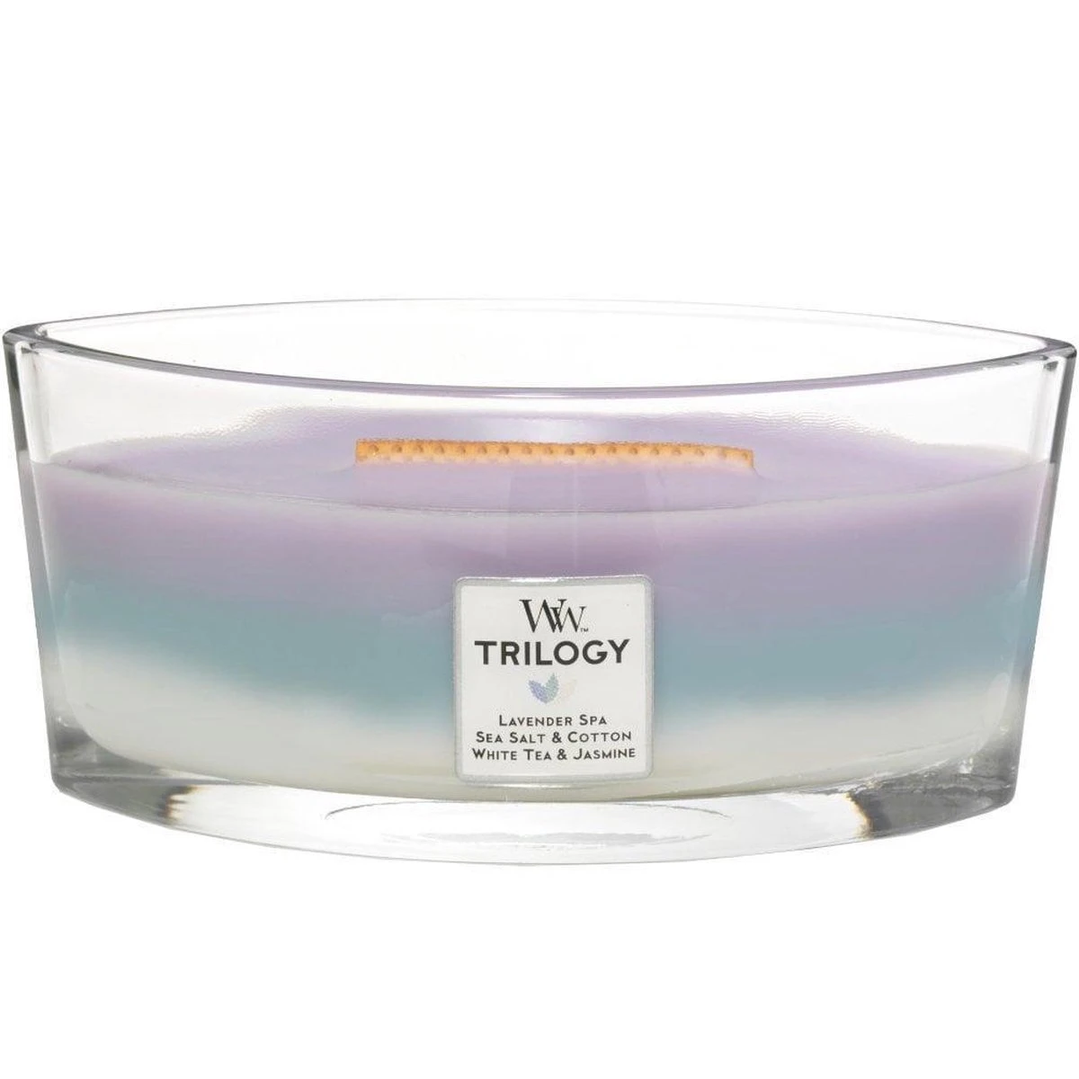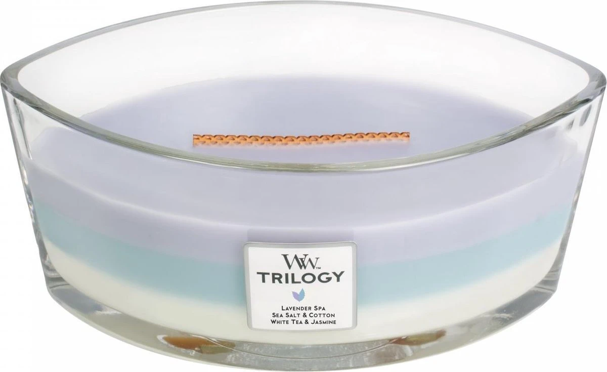 Stel je voor: na een lange dag kom je thuis, ploft op de bank en steekt de kaarsen aan voor wat extra gezelligheid. Wie wil er dan niet een heerlijke, huiselijke geur ruiken zodra de kaarsen aan het branden zijn? Geniet van een trilogy van de geuren Lavender Spa, Sea Salt & Cotton en White Tea & Jasmine. De houten lont geeft een rustgevend knisperend geluid, alsof de haard aanstaat. Time to relax. Met deze WoodWick geurkaars geniet je ongeveer 50 branduren van een heerlijk geurende kaars, die alle zintuigen prikkelt. WoodWick Trilogy Calming Retreat GeurbelevingDeze kaars bevat 3 geuren die je stuk voor stuk kunt ruiken, maar zich ook heerlijk mengen.De geuren zijn: Lavender Spa: Ontspan een dag in de spa met de ontspannende geuren van lavendel en eucalyptus met etherische oliën. Sea Salt & Cotton: De geur van een zilte zeebries met een ondertoon van zacht katoen en lichte houtsoorten. White Tea & Jasmine: Pure witte thee met een vleugje jasmijn vermengt zich zacht met geuren van rode ceder en roos.