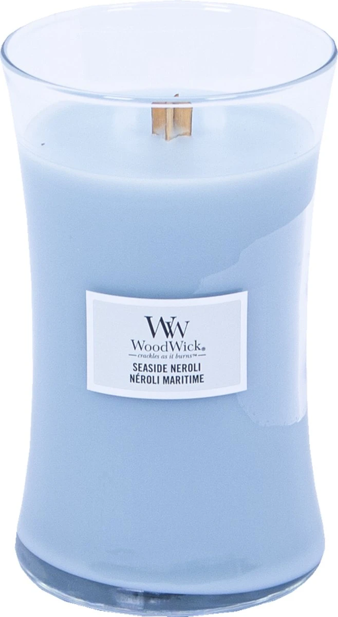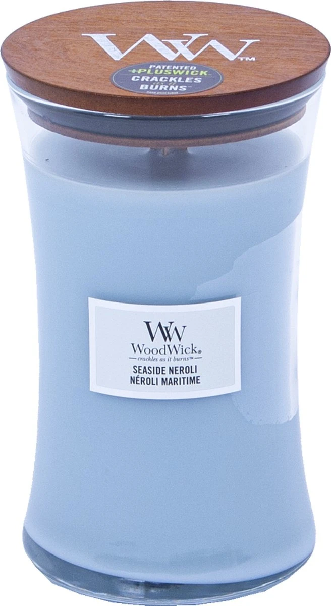 De Coconut & Tonka Large kaars van Woodwick is een bijzondere geurkaars met een heerlijke geur van schoon gedroogde was en een zomerbries. De kaars heeft een ronde zandloper vorm en de houten deksel kan ook als onderzetter gebruikt worden.