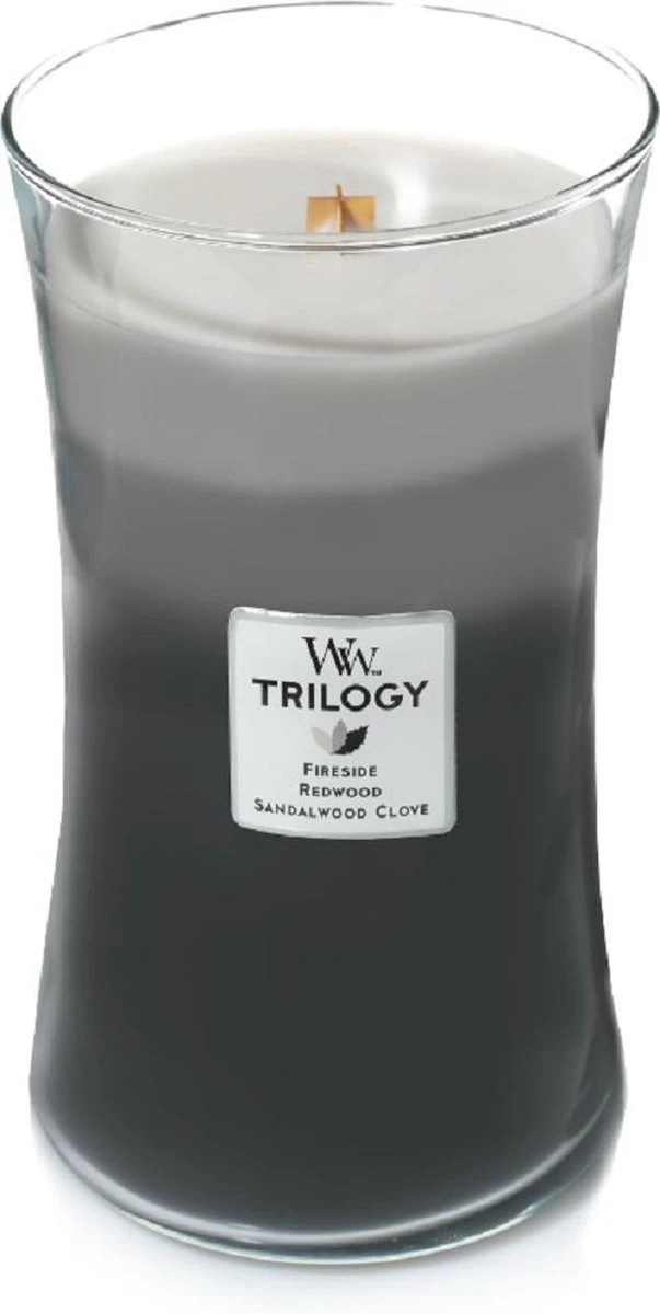 De WoodWick Trilogy Hourglass Large geurkaars – Warm Woods creëert een unieke geurbeleving terwijl de lagen samensmelten.