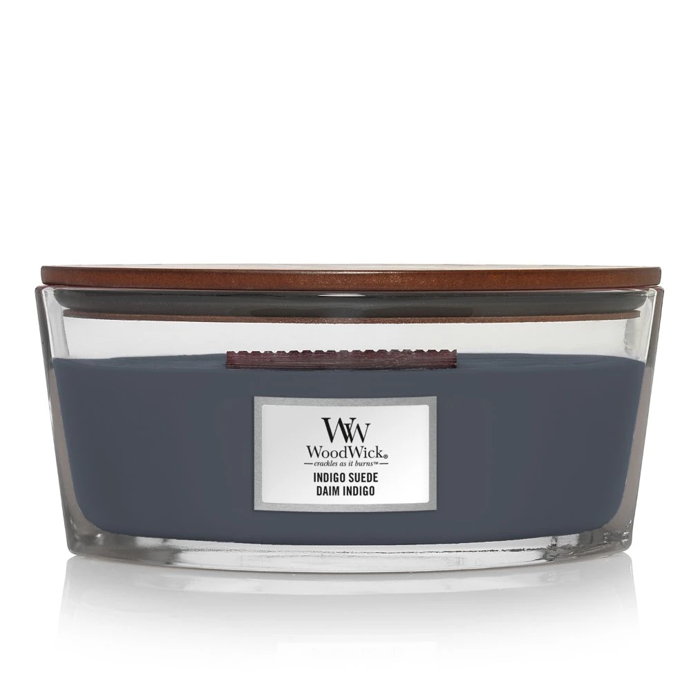 De geurkaars WoodWick Indigo Suede Ellipse Candle