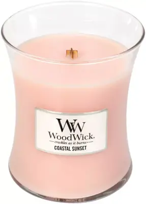 WoodWick geurkaars coastal sunset medium candle is voorzien van een natuurlijk, houten lont waardoor het rustgevende geluid van een knisperend haardvuur een unieke sfeer creëert, terwijl jouw woonruimte gevuld wordt met een authentieke, natuurlijke geur.