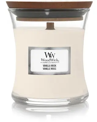 WoodWick geurkaars vanilla musk mini candle is voorzien van een natuurlijk, houten lont waardoor het rustgevende geluid van een knisperend haardvuur een unieke sfeer creëert, terwijl jouw woonruimte gevuld wordt met een authentieke, natuurlijke geur.