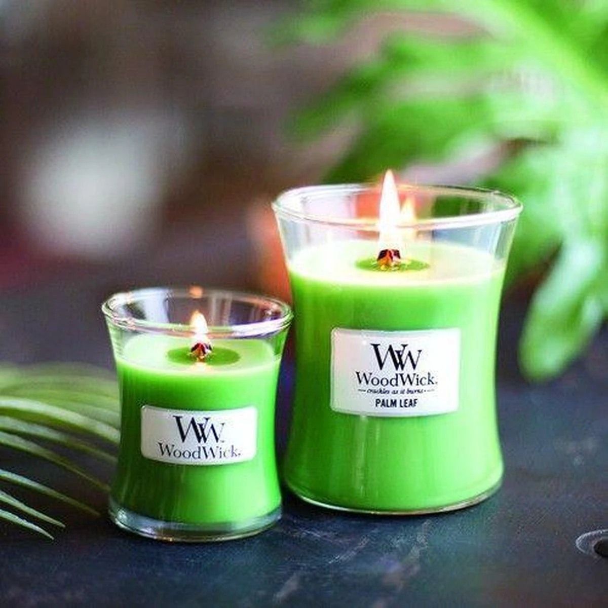 De Palm Leaf Medium kaars van het merk Woodwick is niet zomaar een kaars. Deze bijzondere Palm Leaf geurkaars heeft een houten lont waardoor de vlam je doet denken aan een gezellige kampvuur of openhaard vuur.