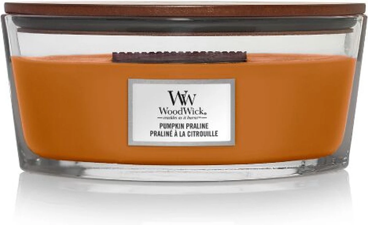 De WoodWick Hourglass Ellipse geurkaars – Pumpkin Praline heeft een heerlijke geur van pompoen gezoet met ahorn en gekruid met gember en nootmuskaat.