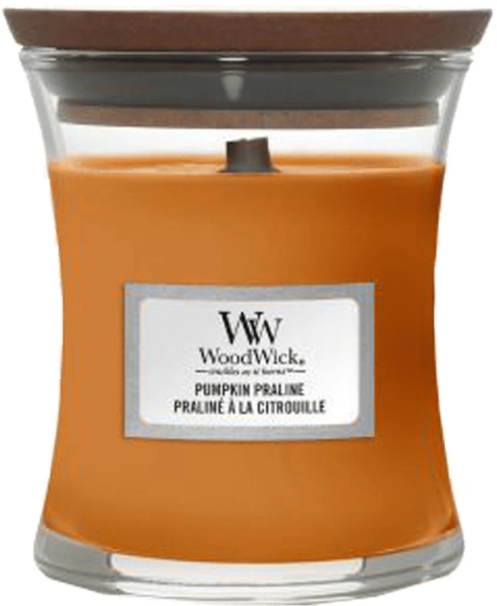 Deze WoodWick kaars heeft een houten lont dat zorgt voor een kenmerkend knetterend geluid. De kaars zit in een zandloper vorm glas en heeft een houten deksel, die tevens ook als onderzetter gebruikt kan worden.